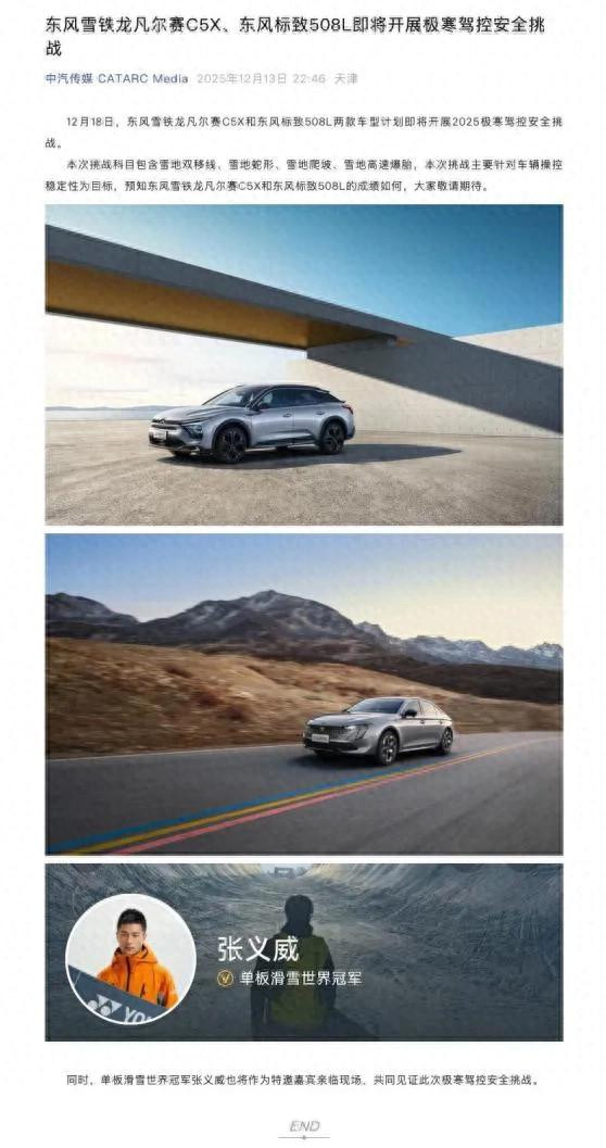 为让更多用户身临其境,感受极寒环境下的车辆表现,神龙汽车将通过官方直播间对验证过程进行实时呈现。直播过程将涵盖关键验证、专业技术解读与互动答疑等环节,届时,还将有中国单板滑雪运动员、单板滑雪世界冠军张义威空降直播间,与观众共鉴冰雪验证,深入了解东风雪铁龙凡尔赛C5 X与东风标致508L的硬核实力。诚邀所有法系知音12月18日14:00锁定神龙汽车官方直播间,共同观看这场极具挑战的冰雪性能展示。