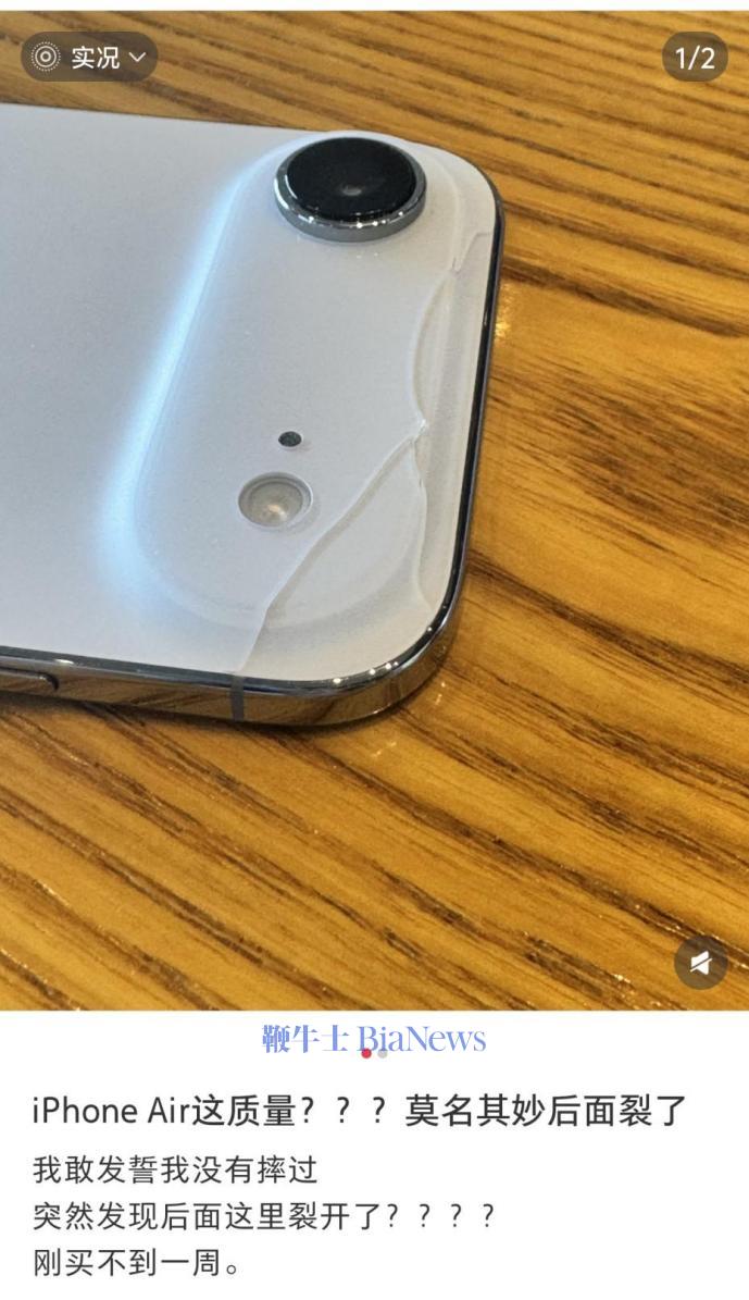 不过,主打轻薄的iPhone Air的用户反馈也两极分化。在社交媒体上,有用户总结称,手感确实很好,但为了轻薄也牺牲了很多配置,比如只有单扬声器,音质差、音量小;电池小、续航一般。另外,还有多位用户吐槽,iPhone Air的后盖比较脆弱,在没有经受很大磕碰的情况下出现了后盖碎裂。